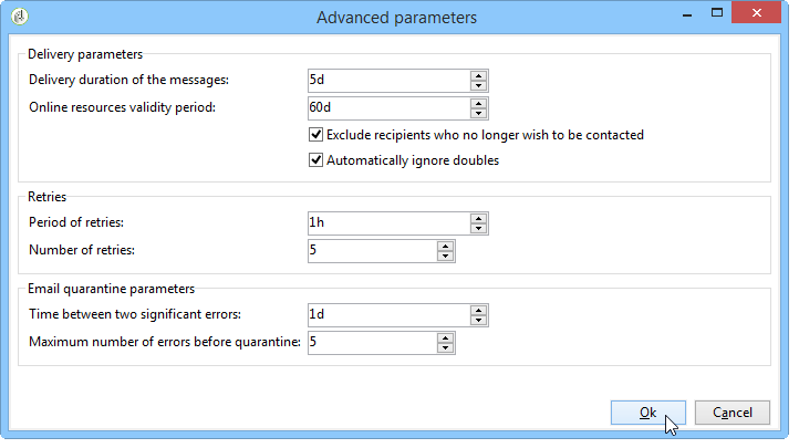 이 창에서 모든 이메일 캠페인에 대해 게재 및 주소 품질 관리 옵션을 정의할 수 있습니다.