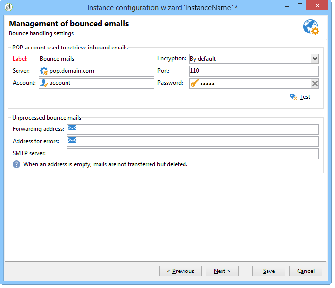 처리되지 않은 바운스 이메일을 전달하려면 Address for errors 필드. 그러나 메일 서버에 많은 부하가 발생할 수 있으므로 사용되는 주소를 정기적으로 확인해야 합니다. 자세한 내용은 계정 담당자에게 문의하십시오.