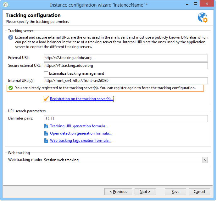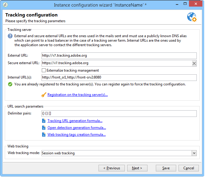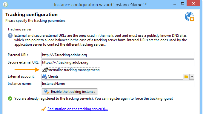 Internal URL(s) : Adobe Campaign 서버가 추적 서버에 문의하여 로그를 수집하고 URL을 업로드하는 데만 사용하는 URL입니다. 인스턴스에 연결할 필요가 없습니다.