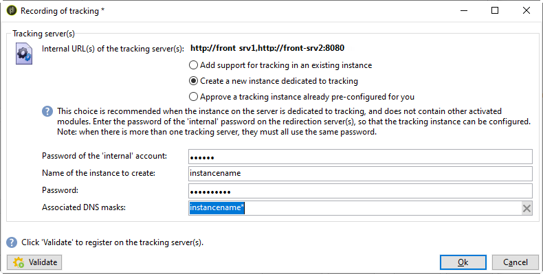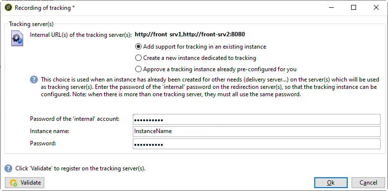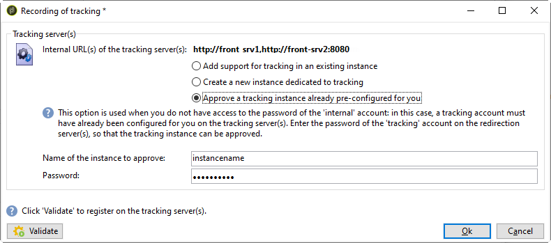 이 옵션은 내부 account; 이 경우 추적 계정은 추적 서버에서 미리 구성되어 있습니다. 리디렉션 서버의 추적 계정 암호를 입력하여 추적 인스턴스의 유효성을 확인합니다.