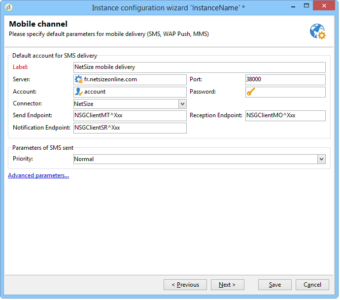 전용 서버의 매개 변수는 Media URL(s), Password 및 Instance name 필드.