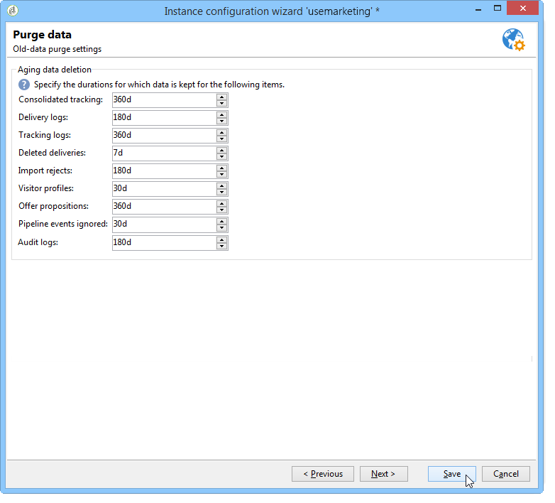 배포 마법사의 마지막 단계에서 사용하지 않는 데이터의 자동 제거를 구성할 수 있습니다. 값은 일 단위로 표시됩니다.