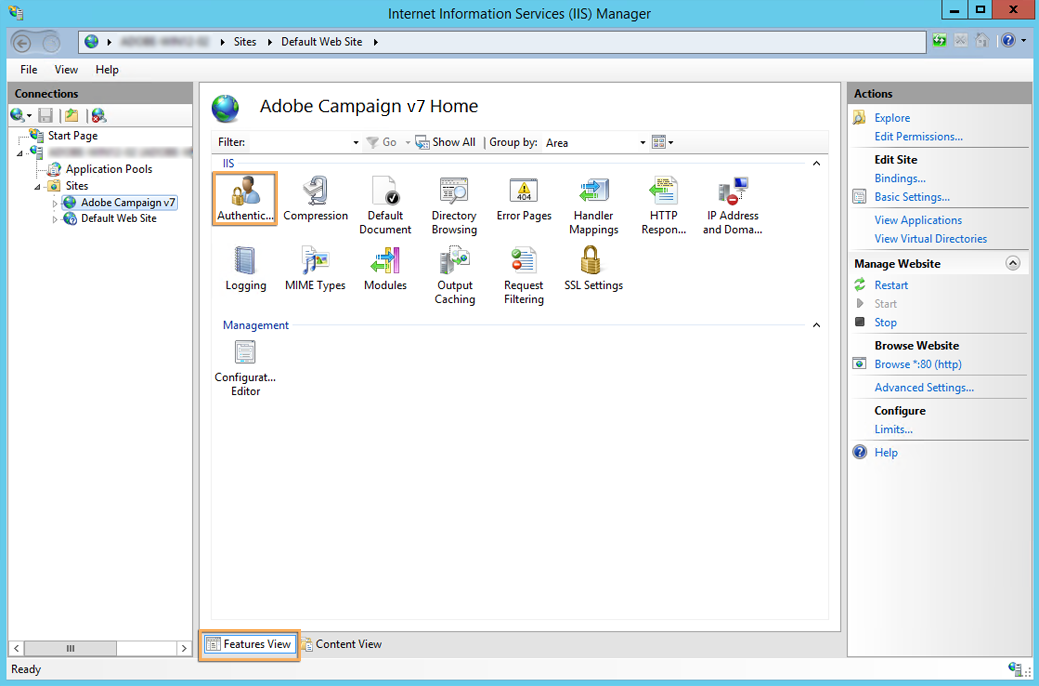 IIS 웹 서버의 구성 프로시저는 대부분 그래픽 방식입니다. 여기에는 웹 사이트(이미 생성되었거나 생성 보류 중인)를 사용하여 Adobe Campaign 서버의 리소스에 액세스해야 합니다. Java(.jsp) 파일, 스타일시트(.css, .xsl), 이미지(.png), 리디렉션 등용 ISAPI DLL.