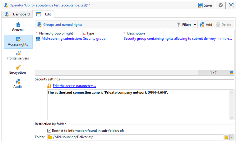 에서 Access rights 탭에서 이 연산자에게 중간 소싱 제출 그룹에 속해 있어야 합니다. 이 액세스 권한은 Mid-sourcing > Access Management > Operator groups.