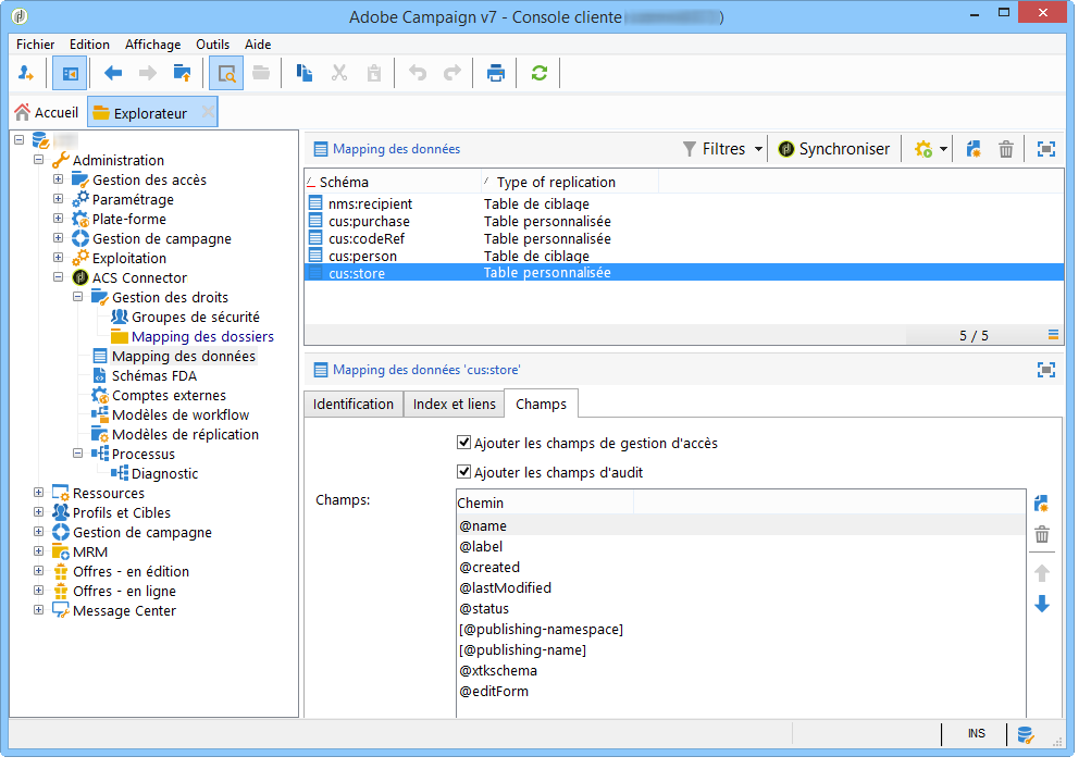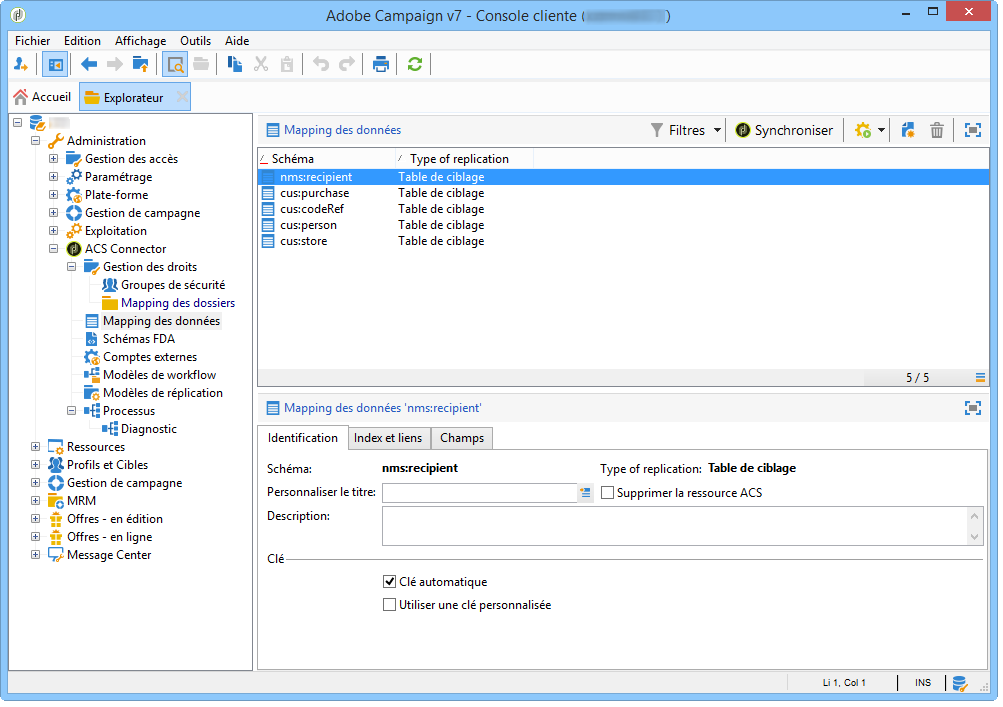 Dans Administration > Connecteur ACS > Mapping des données, créez un mapping de ciblage sur la table nms:recipient.