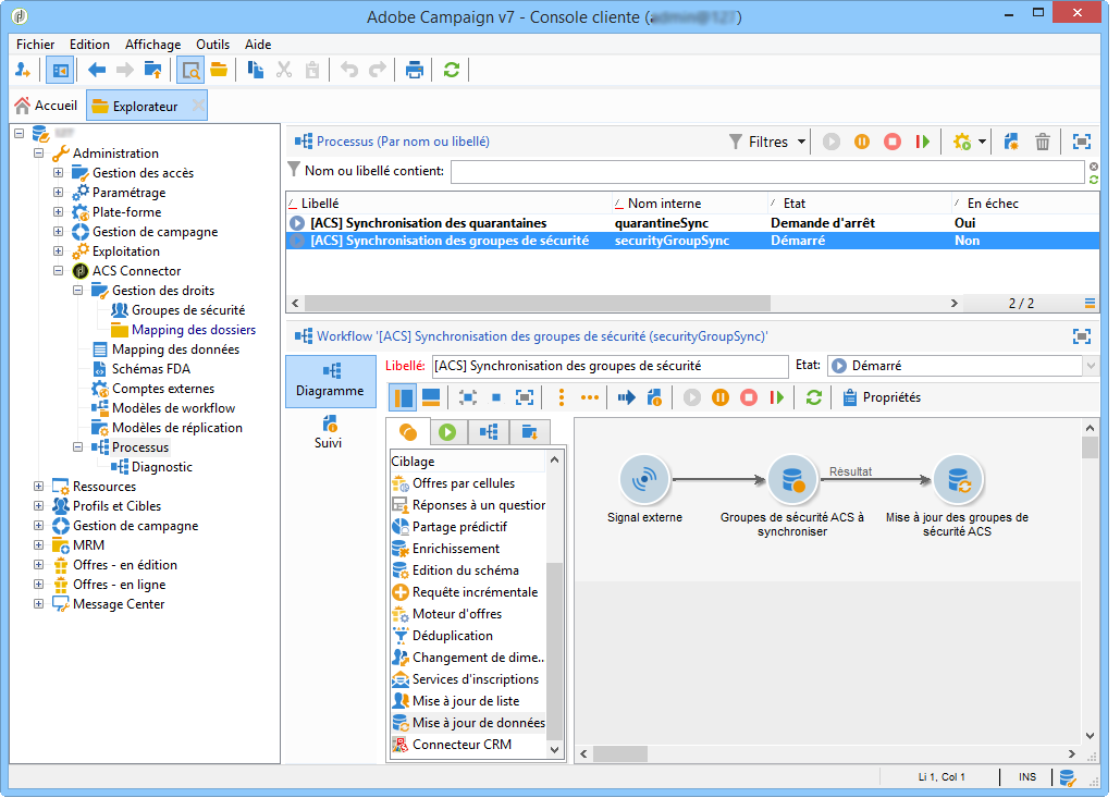 [ACS] Quarantine synchronization(quarantineSync) : ce processus synchronise toutes les informations de quarantaine. Toutes les nouvelles mises en quarantaine dans Campaign v7 sont répliquées dans Campaign Standard. Toutes les nouvelles mises en quarantaine de Campaign Standard sont répliquées dans Campaign v7. Cela garantit que toutes les règles d’exclusion sont synchronisées entre Campaign v7 et Campaign Standard.[ACS] Security group synchronization(securityGroupSync) : ce processus est utilisé pour la conversion des droits. Voir Conversion des droits.