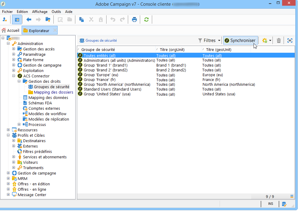Dans Administration > Connecteur ACS > Gestion des droits > Groupes de sécurité, utilisez le bouton Synchroniser pour récupérer tous les groupes de sécurité de Campaign Standard. Les groupes Campaign Standard prêts à l’emploi sont exclus.