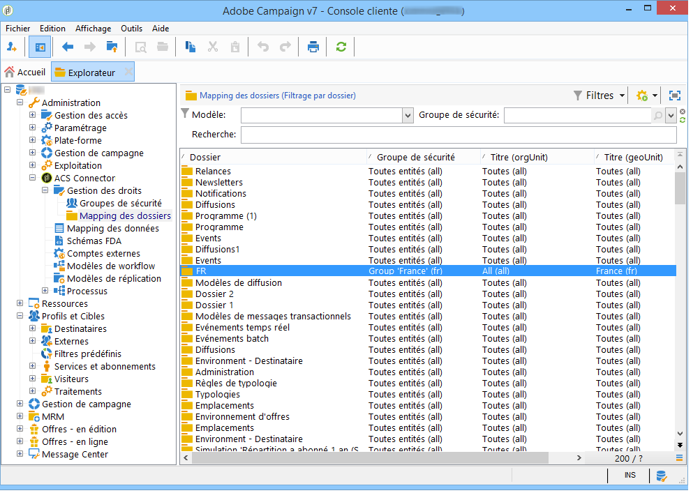 Les droits sont gérés différemment dans Campaign v7 et dans Campaign Standard. Dans Campaign v7, la gestion des droits est basée sur les dossiers, tandis que dans Campaign Standard, elle repose sur l'accès aux entités (entités organisationnelles/géographiques). Un utilisateur de Campaign Standard appartient au groupe de sécurité qui contient le contexte des restrictions. Le système des droits de Campaign v7 doit donc être converti pour correspondre à celui de Campaign Standard. La conversion des droits peut se faire de plusieurs façons. Vous trouverez ci-dessous un exemple de mise en œuvre.