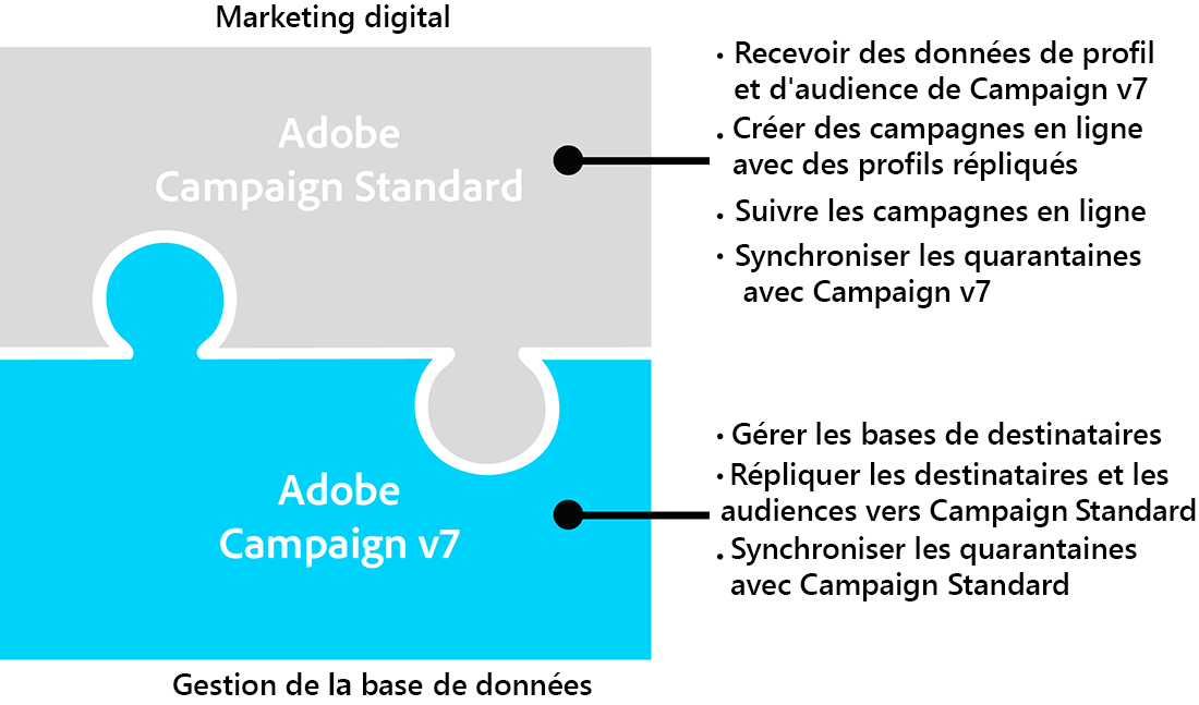 Grâce au connecteur ACS, les spécialistes du marketing digital continuent à utiliser Campaign Standard pour concevoir, cibler et exécuter des campagnes, tandis que Campaign v7 s’adresse aux profils orientés données tels que les spécialistes du marketing de base de données.