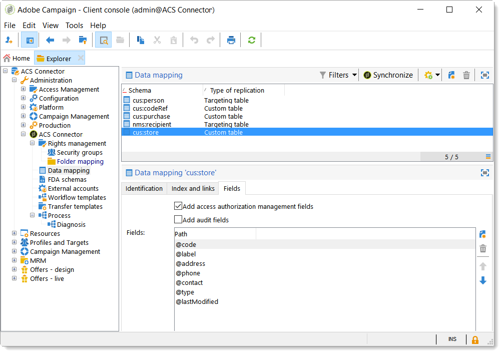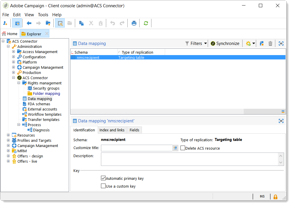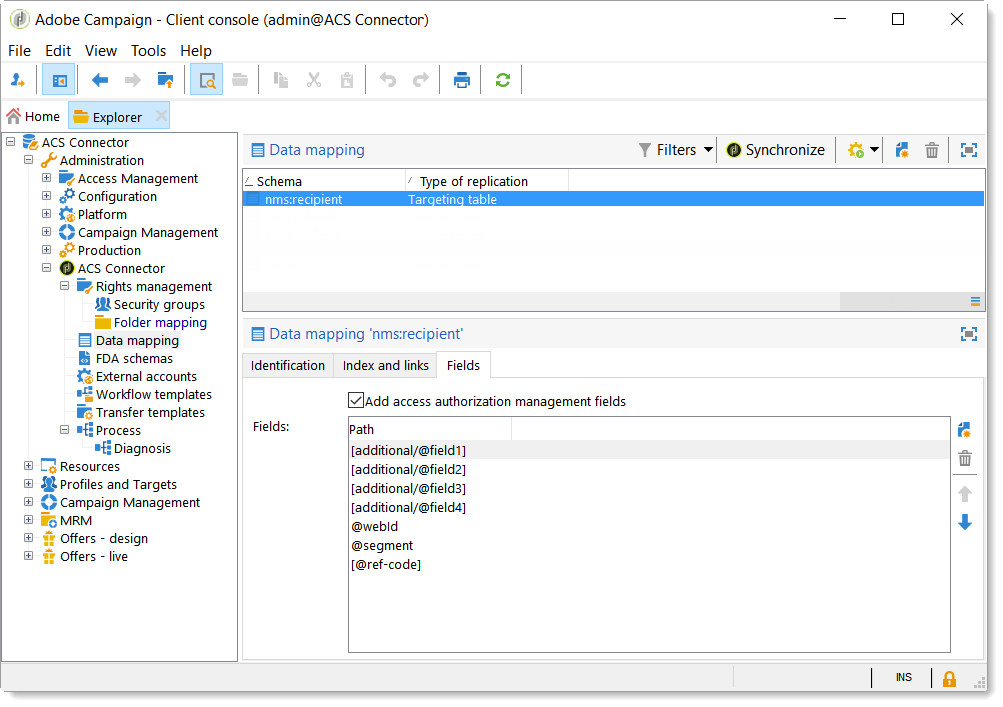 아래 Administration > ACS Connector > Data mapping에서 타겟팅 매핑을 만듭니다. nms:recipient 테이블.