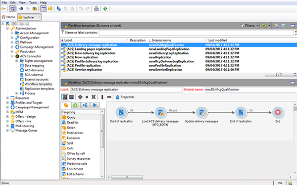 [ACS] Quarantine synchronization (quarantineSync): 이 워크플로우는 모든 격리 정보를 동기화합니다. Campaign v7의 모든 새 격리가 Campaign Standard에 복제됩니다. Campaign Standard의 모든 새 격리가 Campaign v7에 복제됩니다. 이렇게 하면 모든 제외 규칙이 Campaign v7과 Campaign Standard 간에 동기화됩니다.[ACS] Security group synchronization (securityGroupSync): 이 워크플로우는 권한 변환에 사용됩니다. 자세한 내용은 권한 전환.다음 복제 워크플로우를 "사용 준비" 템플릿으로 사용할 수 있습니다. Adobe Campaign 컨설턴트가 구현해야 합니다.