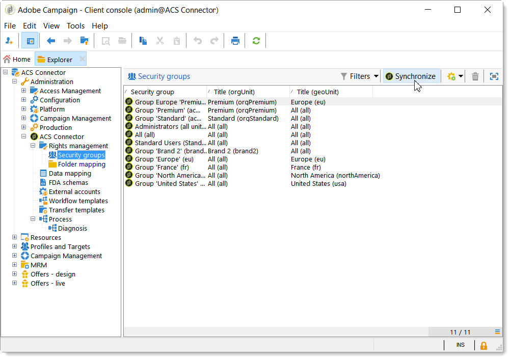 아래 Administration > ACS Connector > Rights management > Security groups를 사용하려면 Synchronize 모든 Campaign Standard 보안 그룹을 검색하는 단추입니다. 기본 제공 Campaign Standard 그룹은 제외됩니다.
