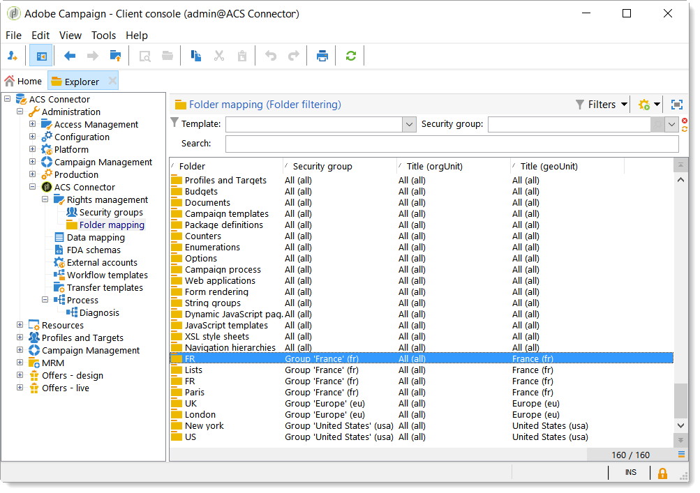권한 관리가 폴더 기반인 경우 다음 위치로 이동하십시오. Administration > ACS Connector > Rights management > Folder mapping 필요한 각 폴더를 보안 그룹에 매핑합니다.