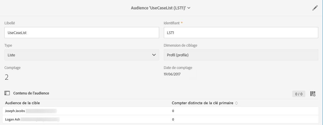 Une fois que le workflow de ciblage a été exécuté dans Campaign v7, l'audience de type liste est accessible en lecture seule dans le menu Audiences de Campaign Standard.
