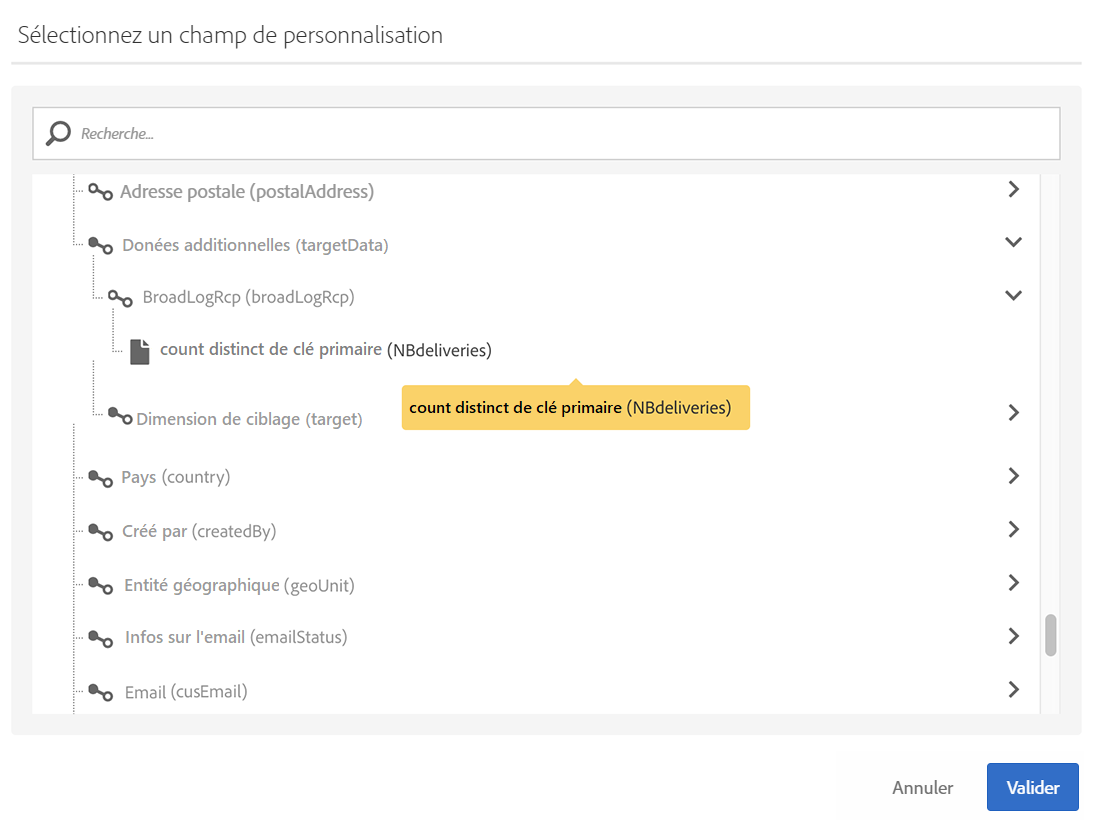 Ajoutez un champ de personnalisation. Dans la fenêtre contextuelle, recherchez le nœud Données additionnelles (targetData). Ce nœud contient les données additionnelles de l'audience qui ont été calculées dans le workflow de ciblage initial. Vous pouvez les utiliser comme tout autre champ de personnalisation.