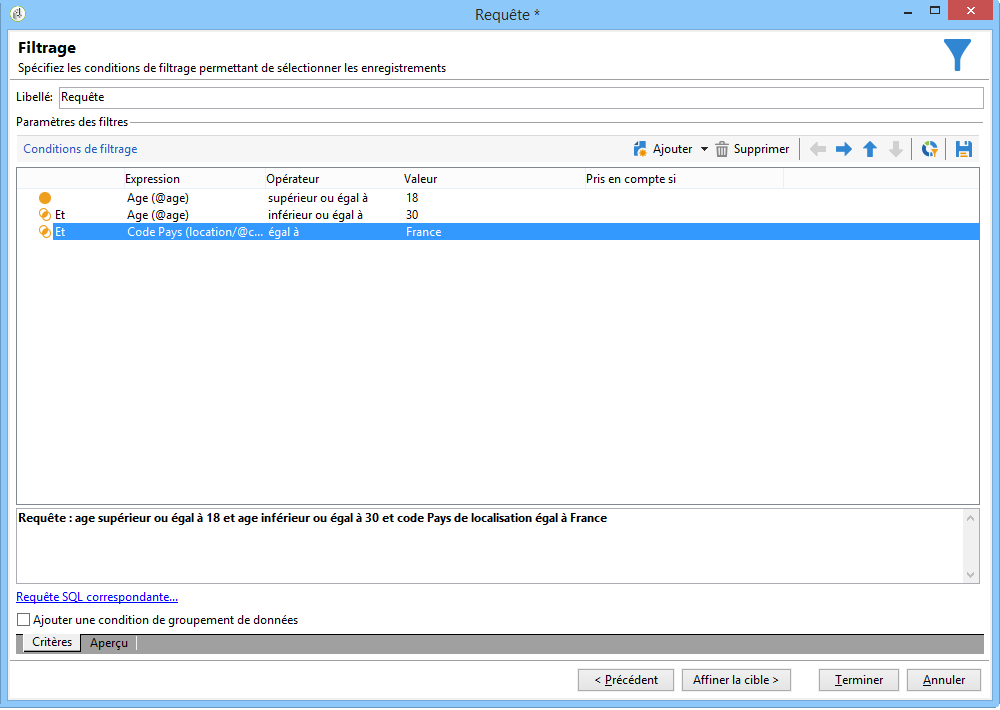 Ajoutez une activité Requête et sélectionnez les destinataires auxquels vous souhaitez envoyer l'email final, tels que par exemple, tous les destinataires ayant entre 18 et 30 ans et habitant en France.