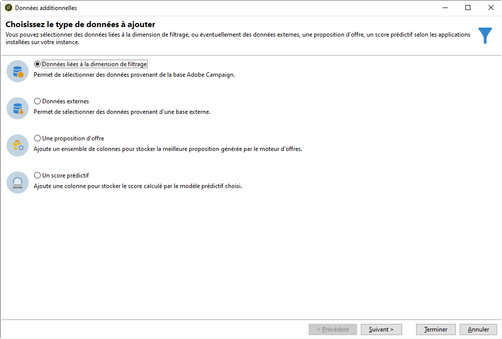 Sélectionnez Données liées à la dimension de filtrage, puis cliquez sur Suivant.