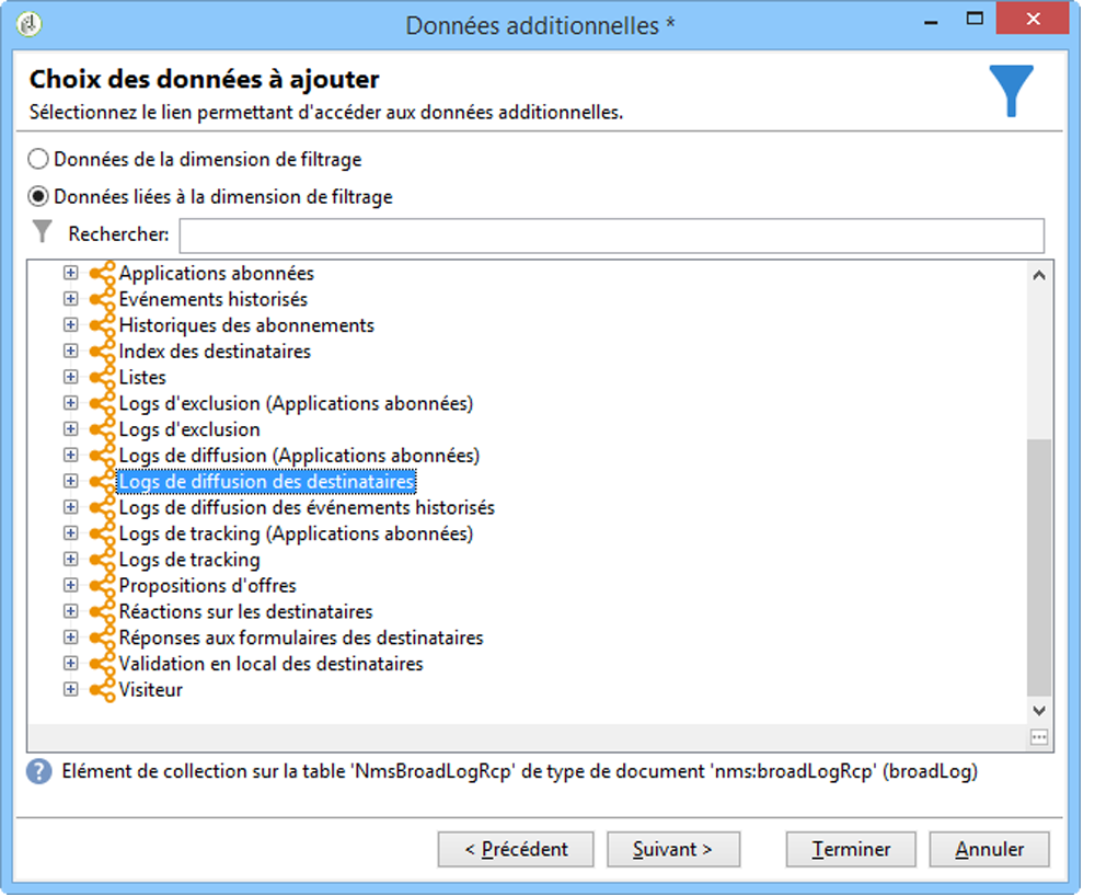 Sélectionnez Données liées à la dimension de filtrage, puis le nœud Logs de diffusion du destinataire. Cliquez ensuite sur Suivant.