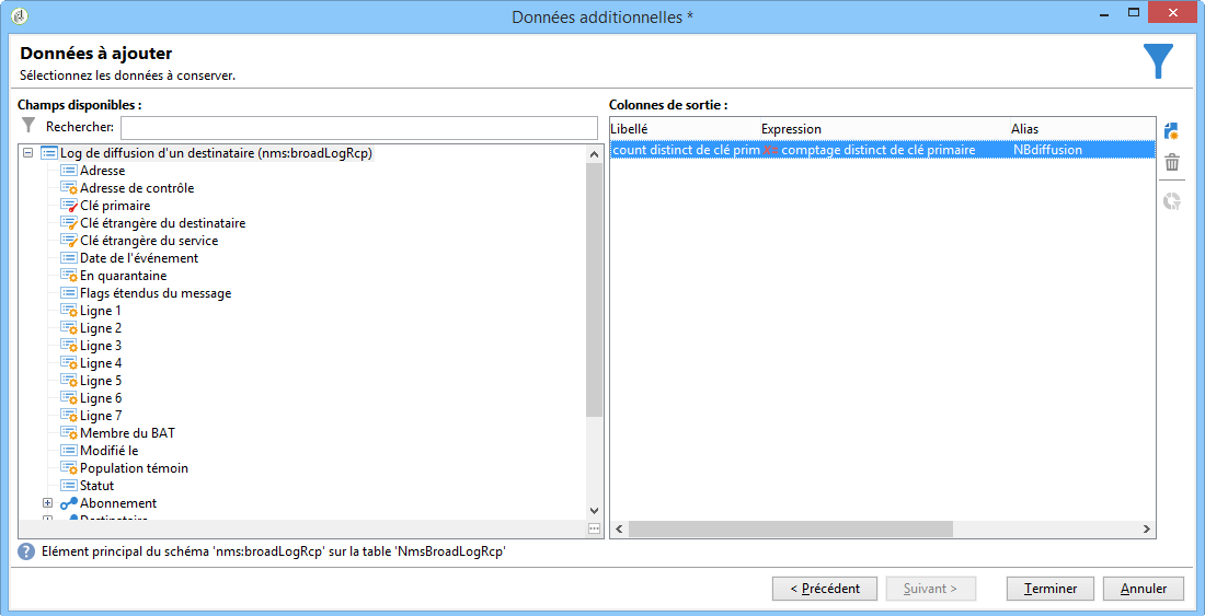 Définissez les colonnes de sortie. Dans le cas présent, seule la colonne permettant de compter le nombre de diffusions est nécessaire. Pour la définir :