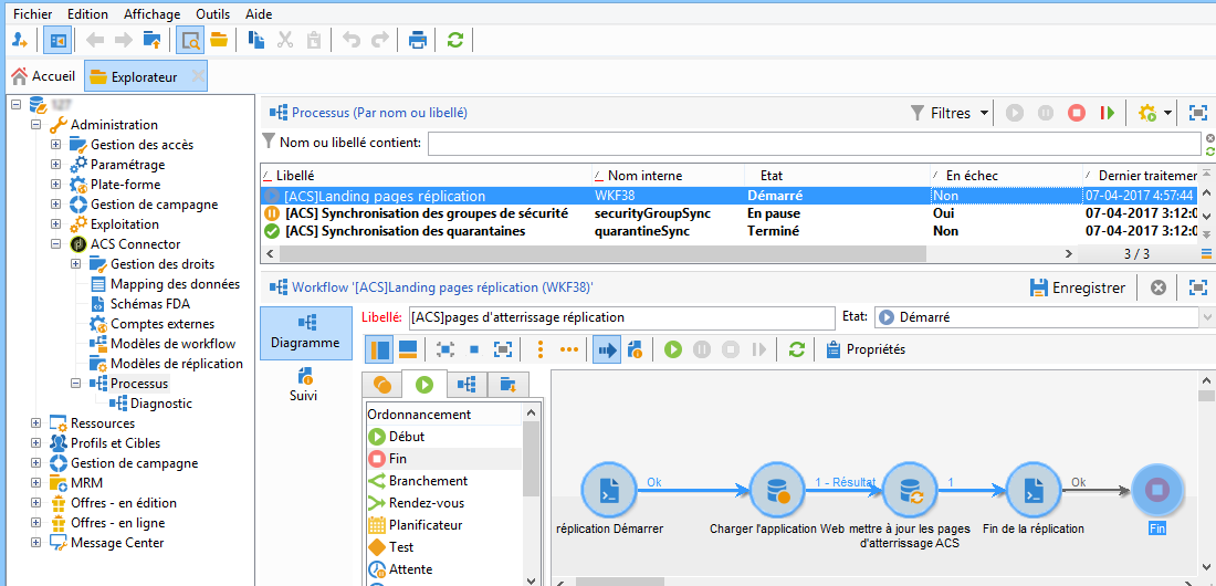 Afin de répliquer les données nécessaires entre Campaign v7 et Campaign Standard, plusieurs modèles de workflows de réplication sont disponibles. Le workflow de Réplication des profils reproduit automatiquement tous les destinataires de Campaign v7 vers Campaign Standard. Voir Workflows techniques et de réplication. Le workflow de Réplication des landing pages permet la réplication des applications Web que nous voulons utiliser dans Campaign Standard.