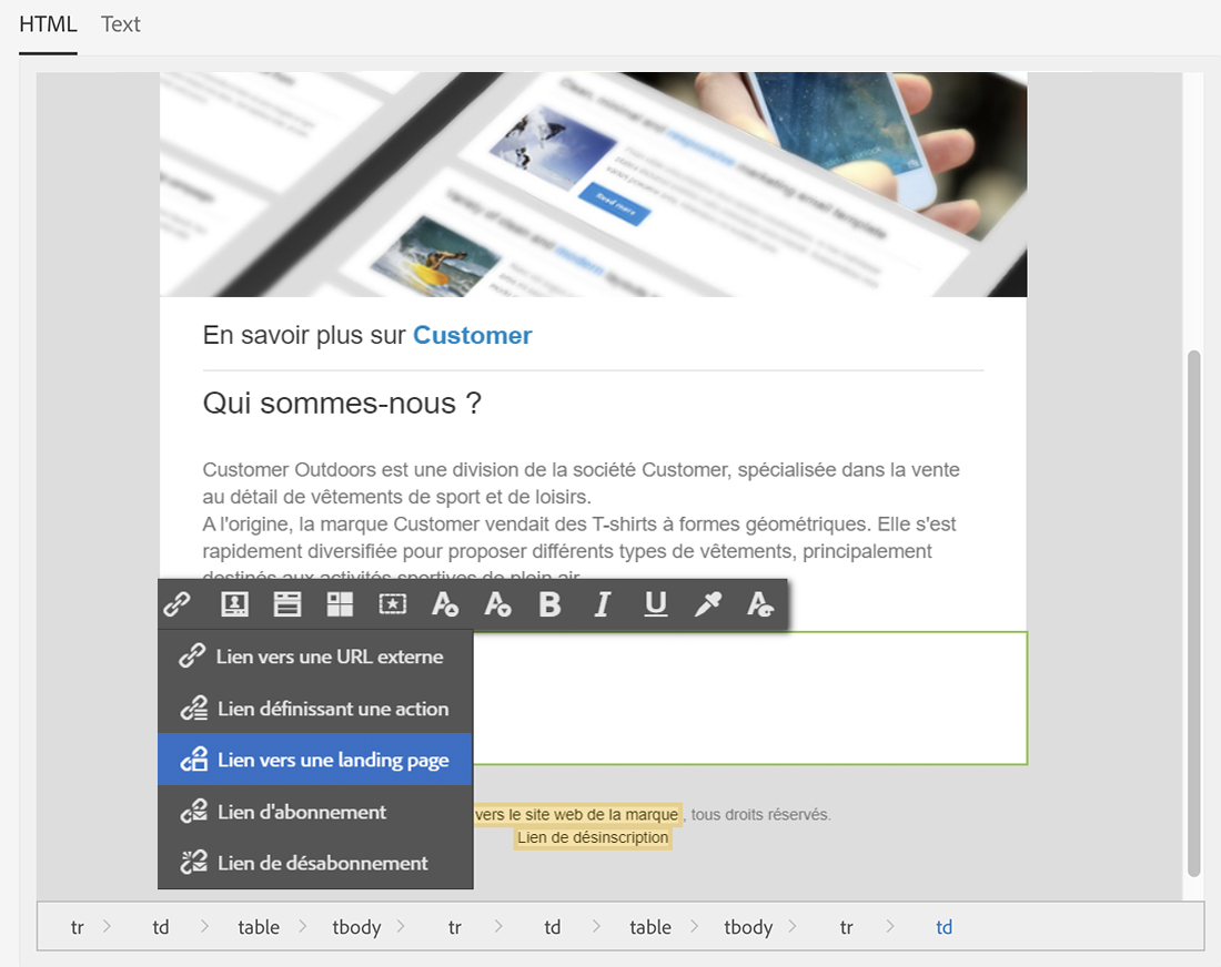 Editez le contenu et insérez un Lien vers une landing page.