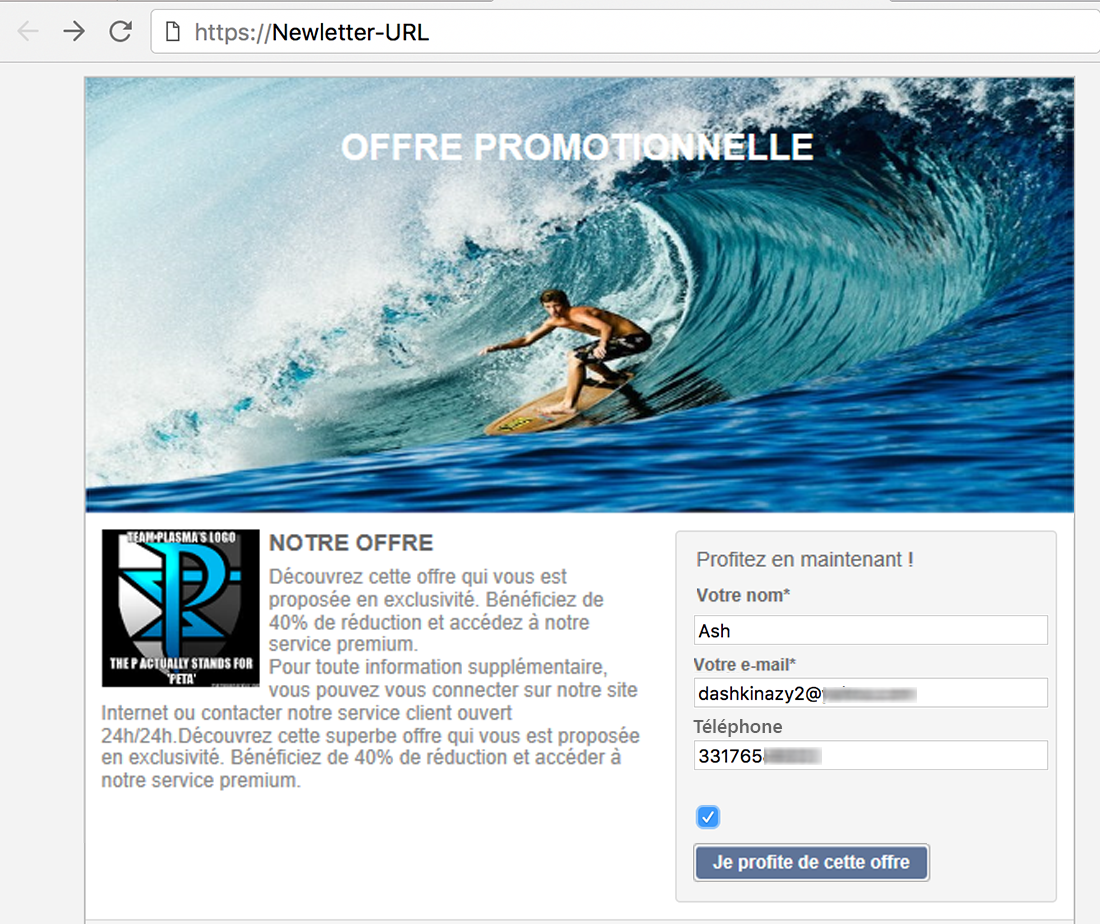 Ce destinataire ajoute un numéro de téléphone et coche la case d’inscription à la newsletter.