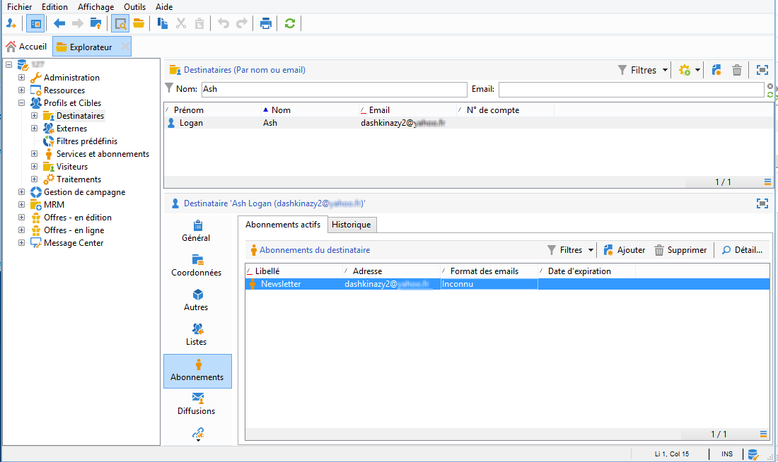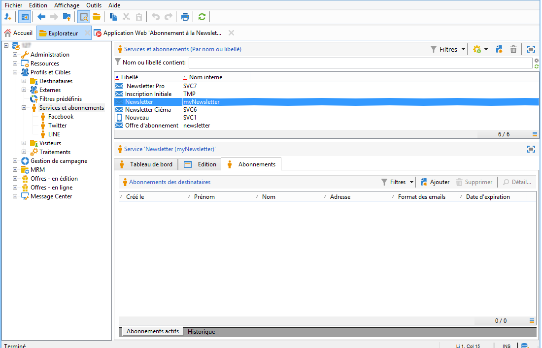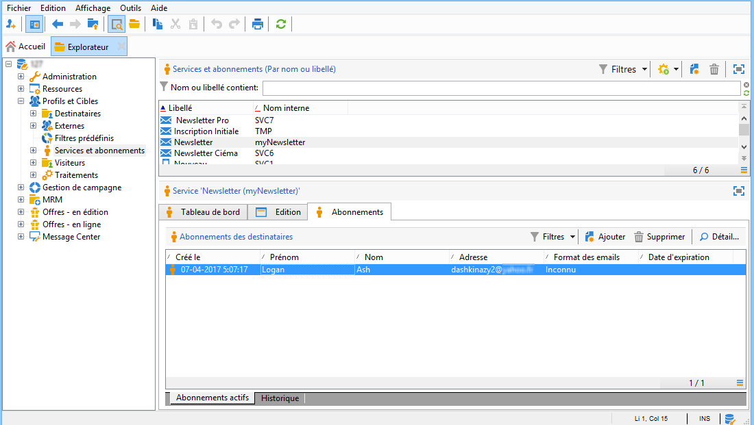 Dans Campaign v7, accédez à Profils et Cibles > Services et abonnements, puis ouvrez le service Newsletter. Vous pouvez voir que le destinataire apparaît désormais dans la liste des abonnés.