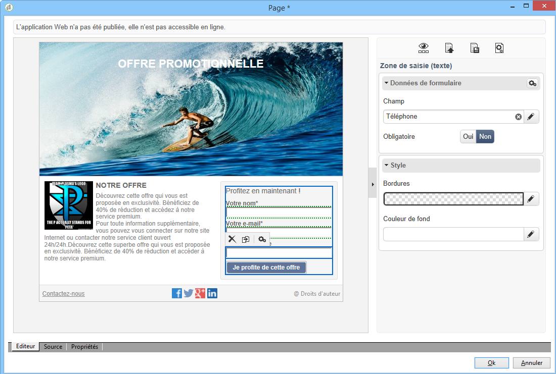 Modifiez la Page. Trois champs (Nom, Email et Téléphone) ont été ajoutés, ainsi qu'une case à cocher invitant le destinataire à s'inscrire à une newsletter (service Newsletter).