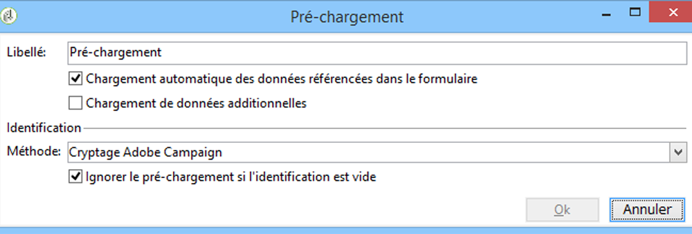 Modifiez l'activité Pré-chargement. La case Chargement automatique des données référencées dans le formulaire est cochée et la méthode d'identification Chiffrement Adobe Campaign est sélectionnée. L'application web peut ainsi précharger les champs du formulaire avec les données stockées dans la base de données d'Adobe Campaign. Pour plus d'informations, consultez ce document.