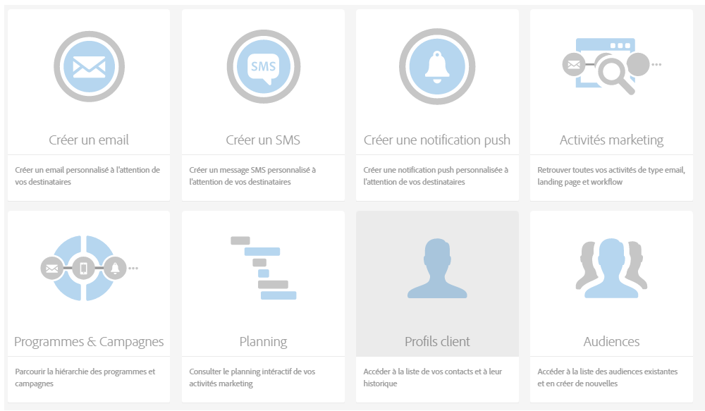 Dans la barre supérieure, cliquez sur Activités marketing, puis cherchez l'application web de Campaign v7. Elle apparaît sous forme de landing page dans Campaign Standard.