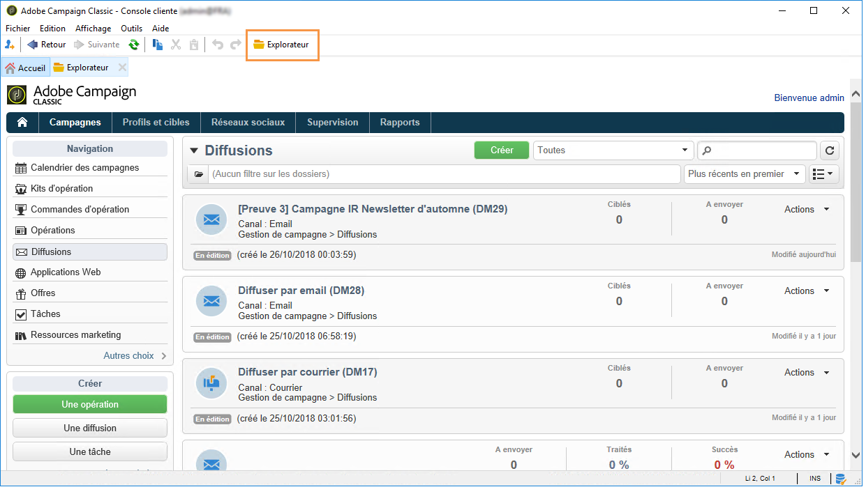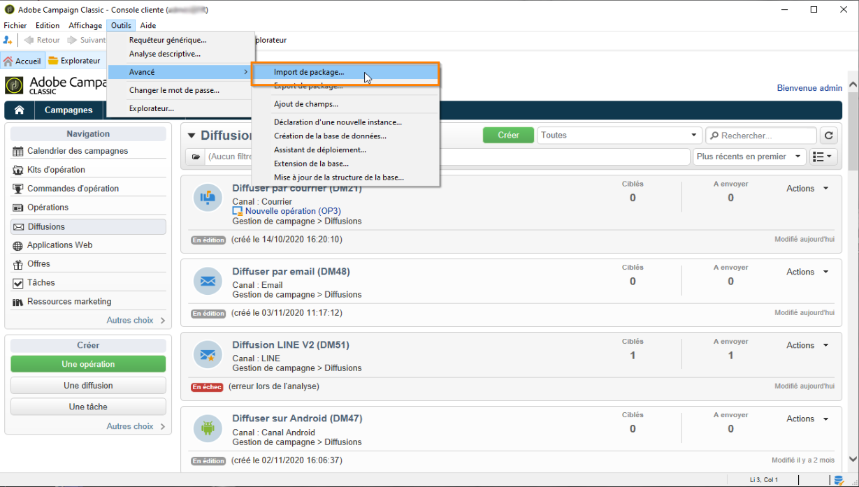 Depuis votre instance Adobe Campaign, sélectionnez Outils dans la barre d'outils supérieure.
