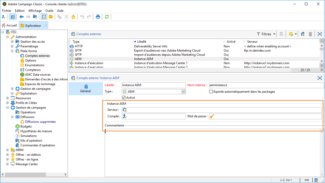 Le package AEM Integration définit l'opérateur aemserver dans Campaign. Cet opérateur sera utilisé pour connecter le serveur Adobe Experience Manager à Adobe Campaign.