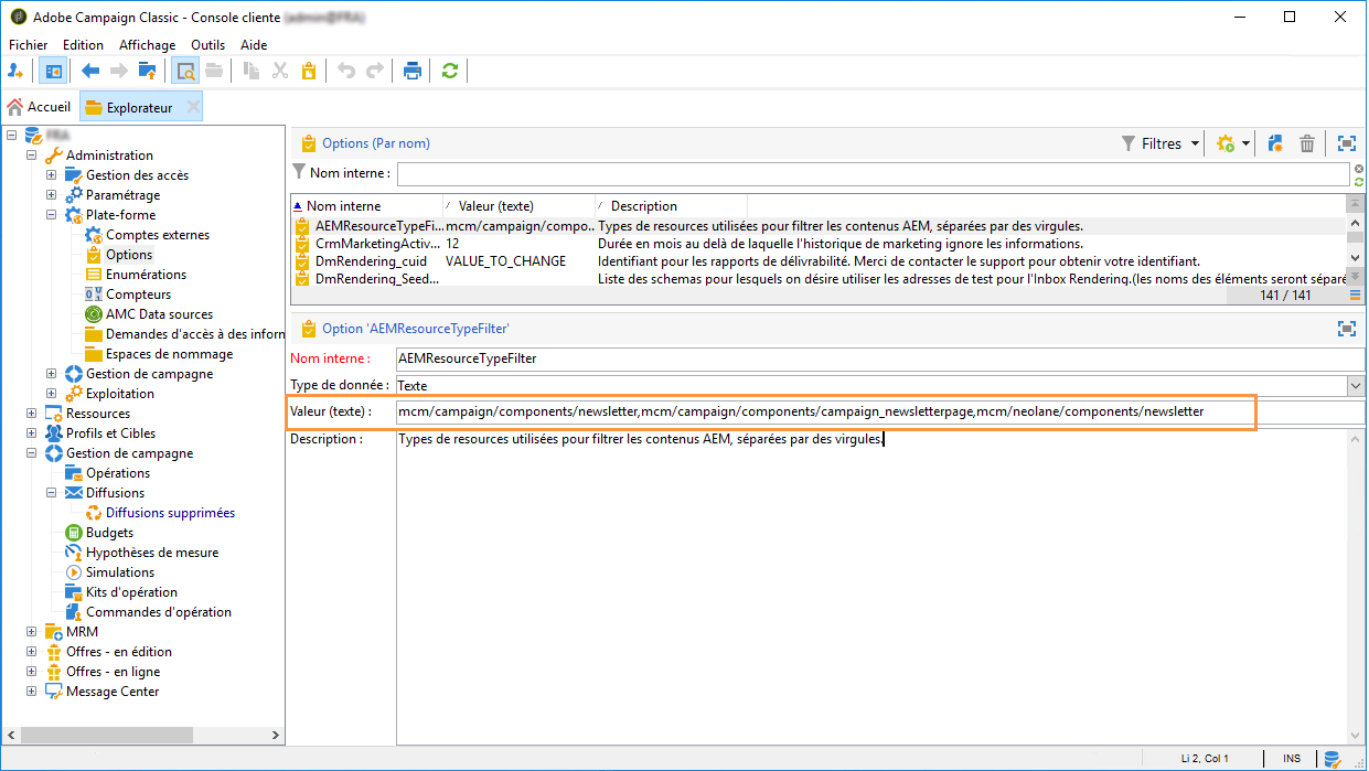 L'option AEMResourceTypeFilter sert à filtrer les types de ressources Experience Manager pouvant être utilisés dans Adobe Campaign. Adobe Campaign peut ainsi récupérer les contenus Experience Manager spécialement conçus pour être utilisés uniquement dans Adobe Campaign.