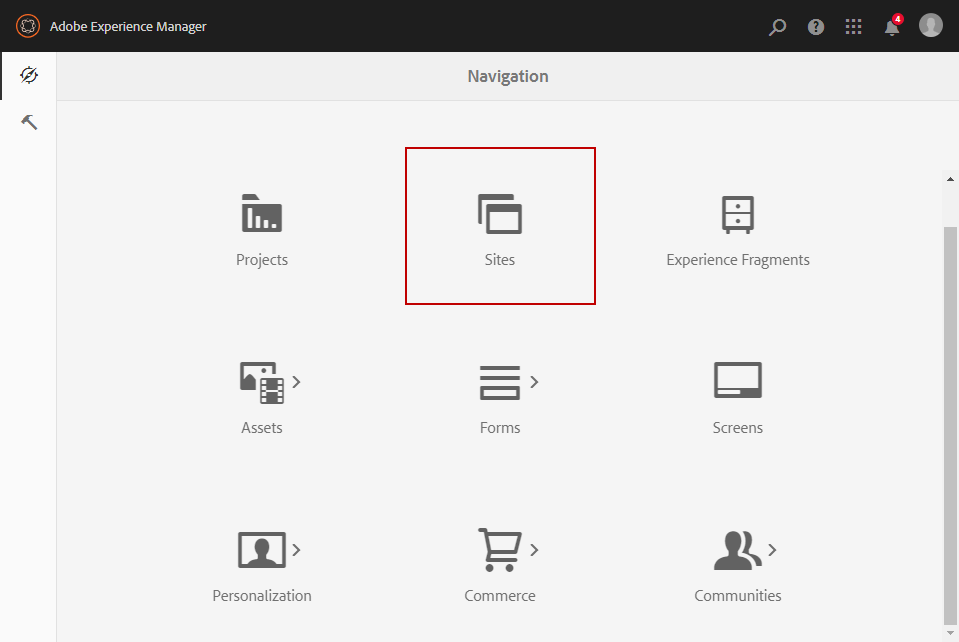 AEM 작성자 인스턴스에서 Adobe Experience 페이지의 왼쪽 상단에 있는 로고를 선택하고 Sites.