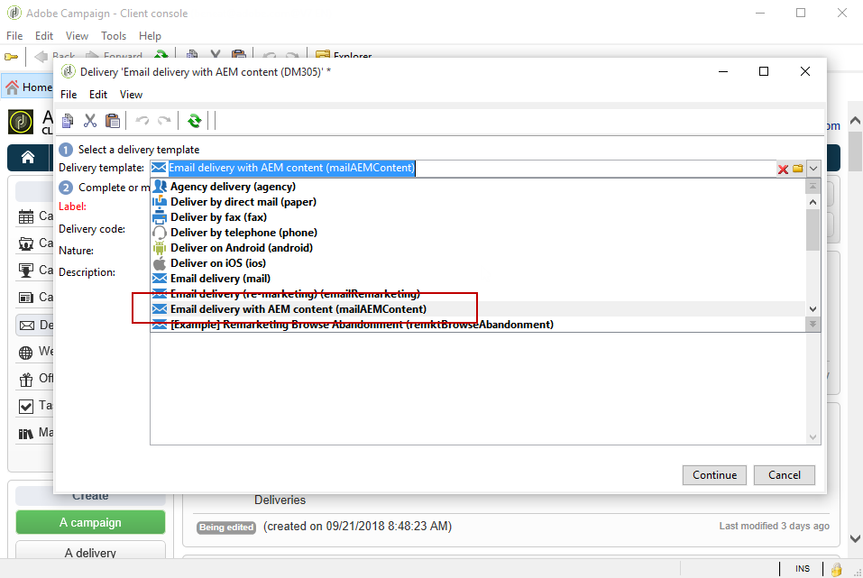 에서 Delivery template 드롭다운에서 Email delivery with AEM content (mailAEMContent) 템플릿.