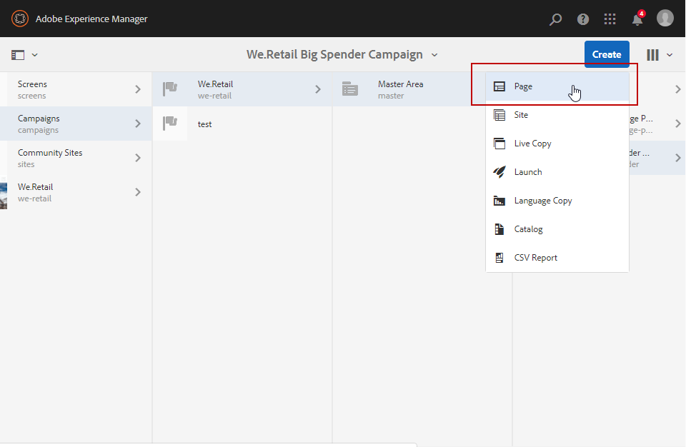을(를) 클릭합니다. Create 페이지의 오른쪽 위에 있는 버튼을 선택한 다음 Page.
