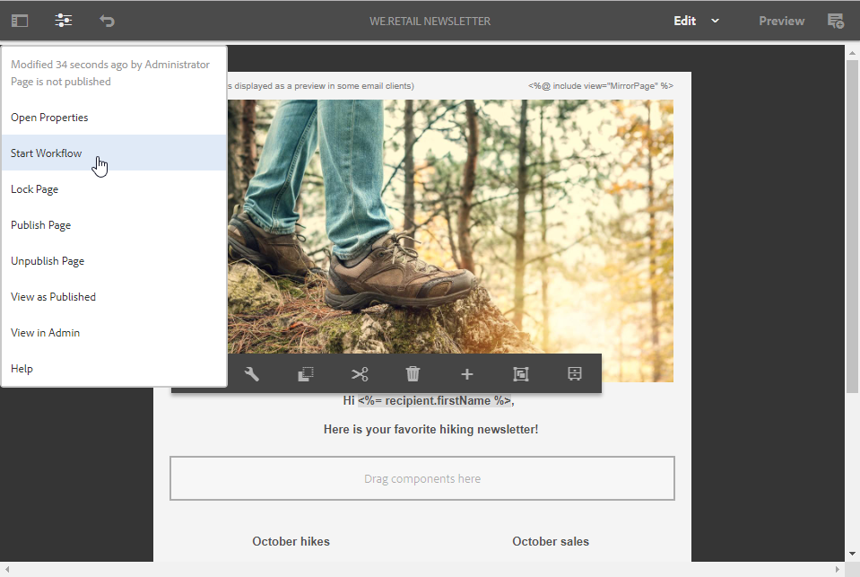 전자 메일이 준비되면 Page information 메뉴를 클릭하고 Start workflow.