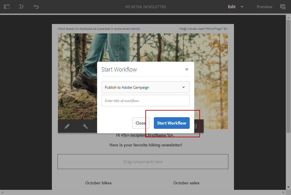 첫 번째 드롭다운에서 을 선택합니다. Publish to Adobe Campaign 워크플로우 모델 을 클릭하고 Start workflow.