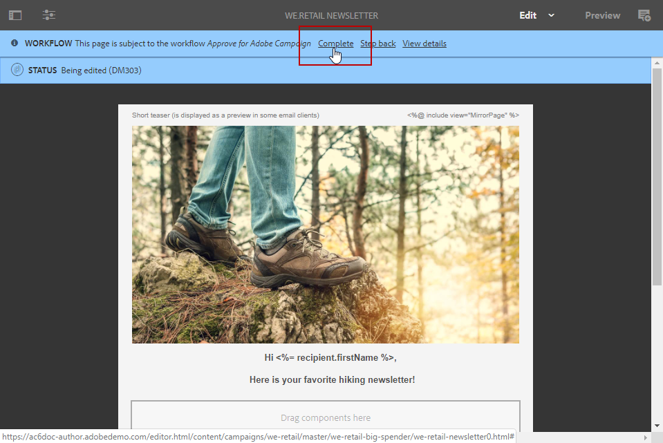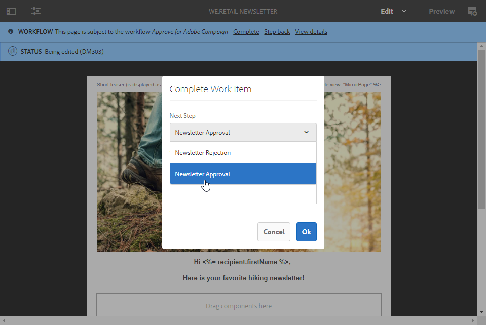 다시 클릭 Complete 을(를) 선택합니다. Newsletter approval 에서 Next Step 드롭다운.