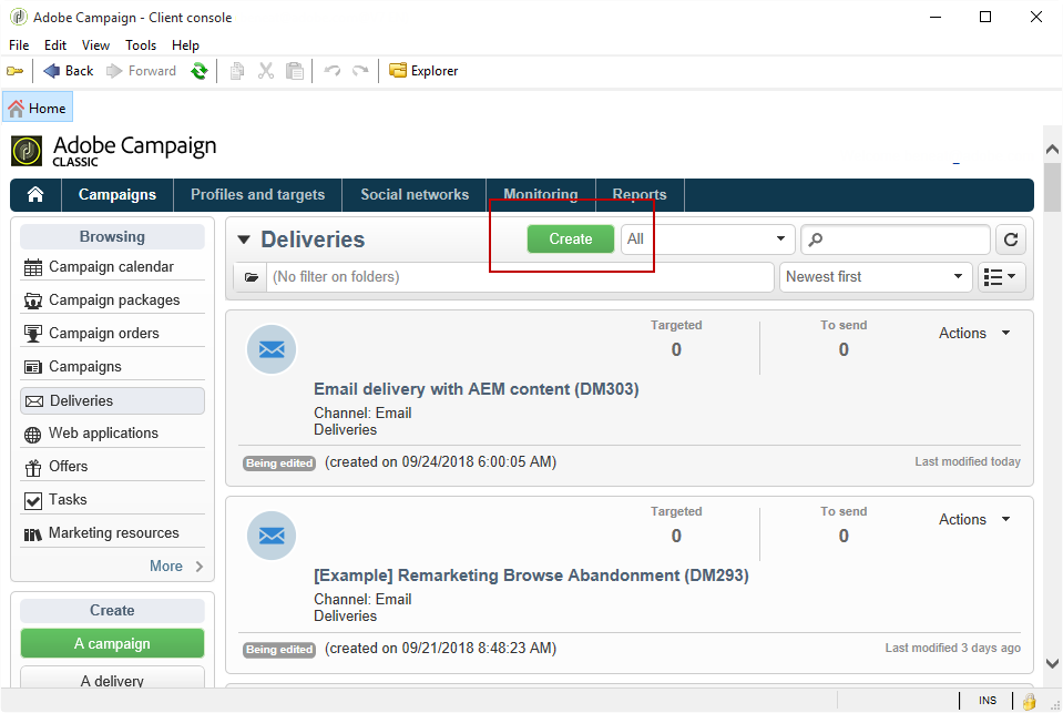 에서 Campaigns 탭, Deliveries 그런 다음 Create.