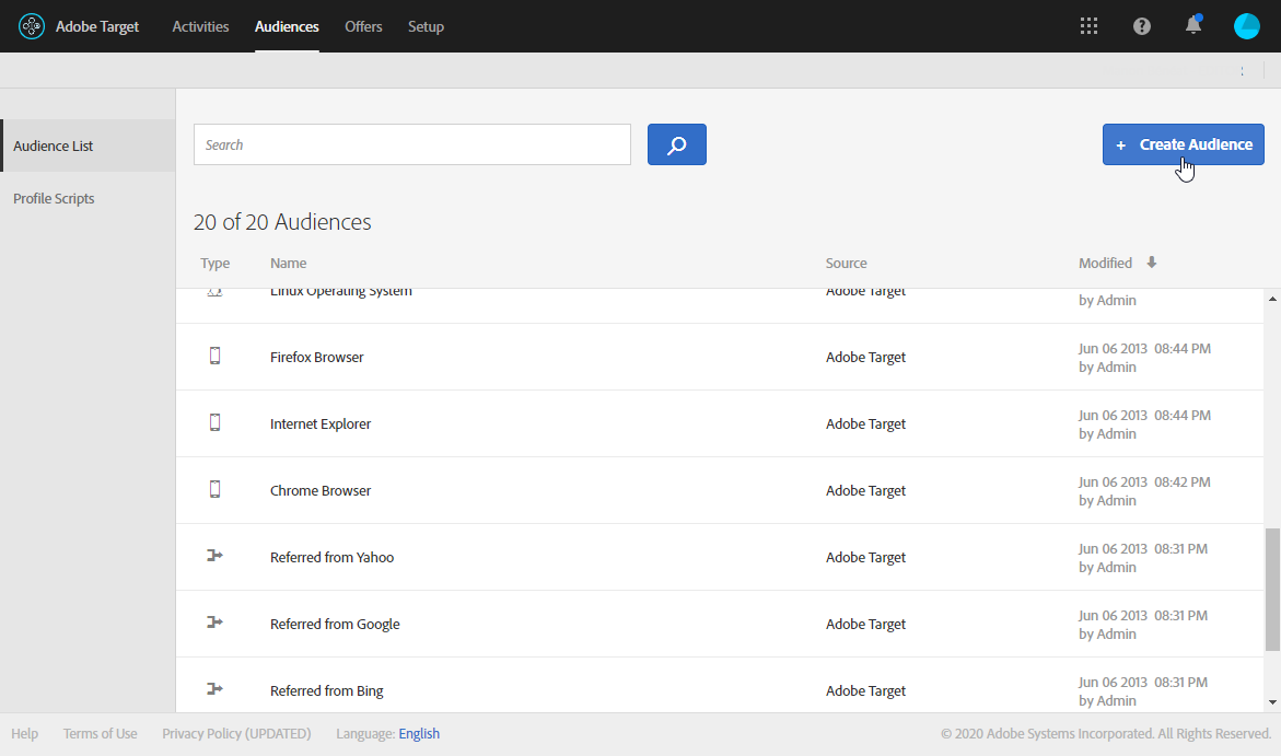 Pour créer une audience avec Target, dans l'onglet Audiences, cliquez sur Créer une audience.