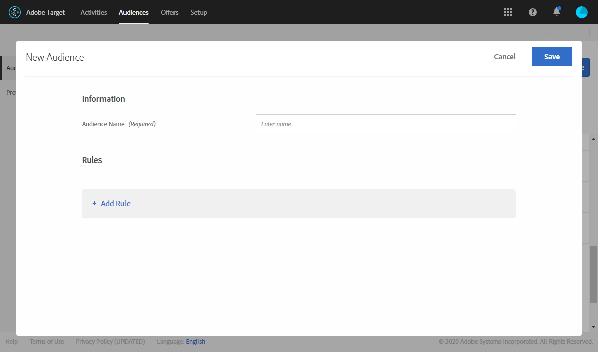 Avec Target, vous devez créer les deux audiences dans lesquelles les visiteurs de votre offre seront classés selon les différents contenus à diffuser. Pour chaque audience, ajoutez une règle pour définir qui pourra visualiser l’offre.