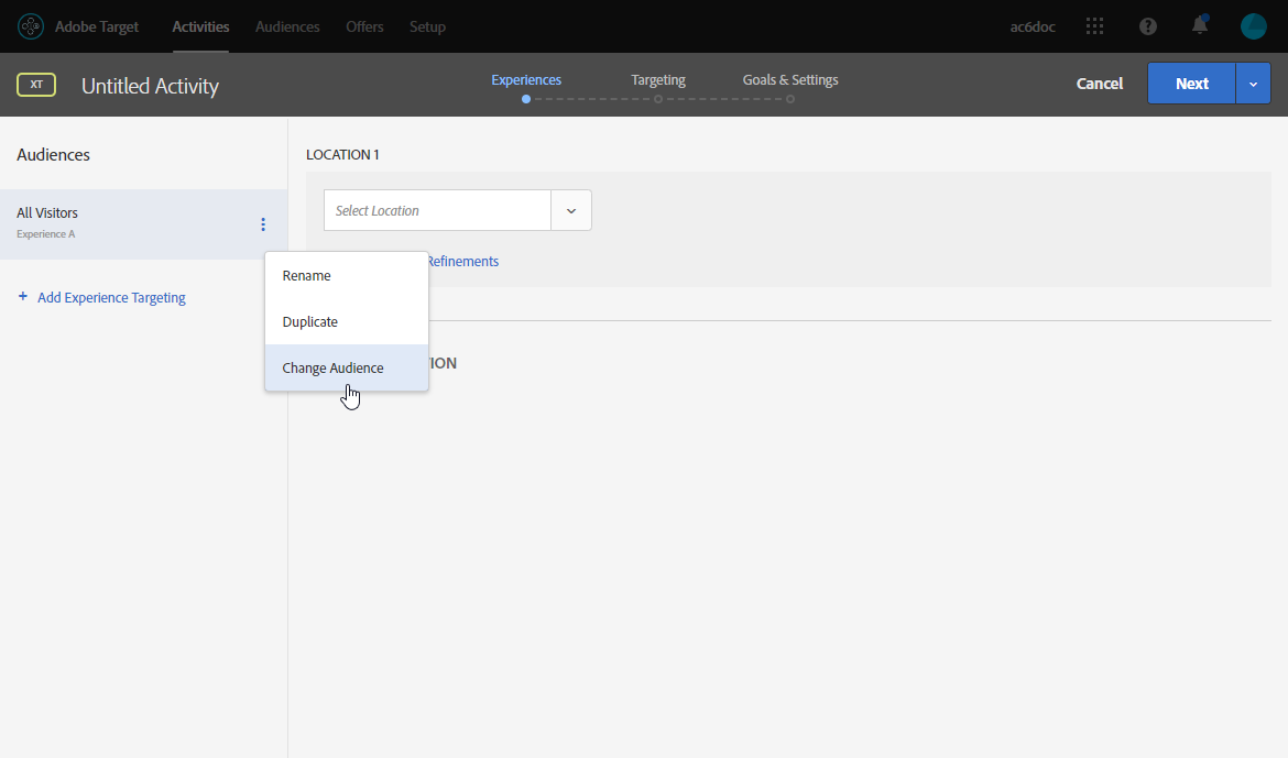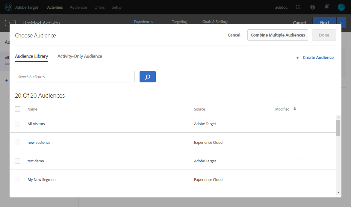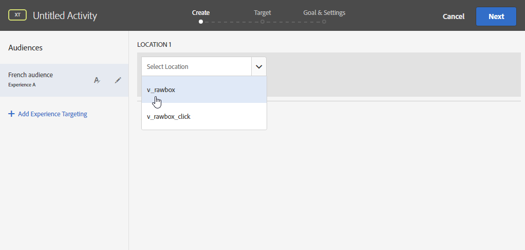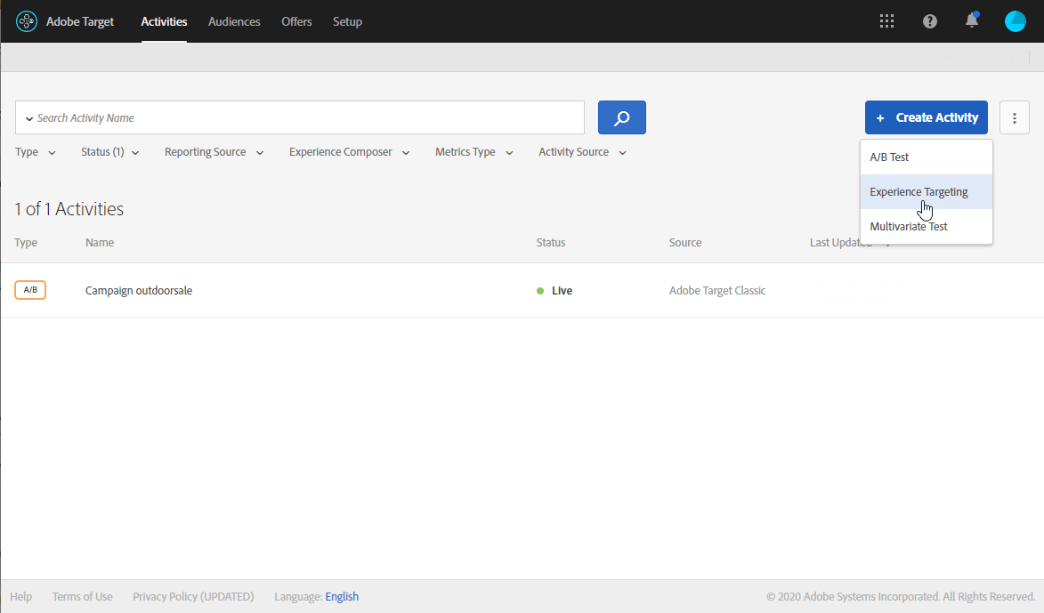 Pour créer une activité de ciblage d'expérience, dans l'onglet Activités, cliquez sur Créer une activité, puis sur Ciblage d'expérience.