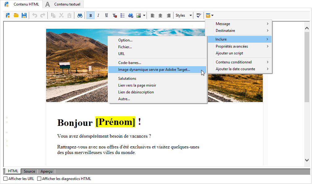 Si vous utilisez l'éditeur standard, placez le curseur à l'endroit où vous souhaitez insérer l'image et sélectionnez Inclure > Image dynamique servie par Adobe Target… dans le menu déroulant de personnalisation.