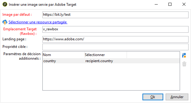 Pour ce faire, spécifiez l’URL de l’image par défaut, le nom de l’emplacement et les champs que vous souhaitez transférer à Target.