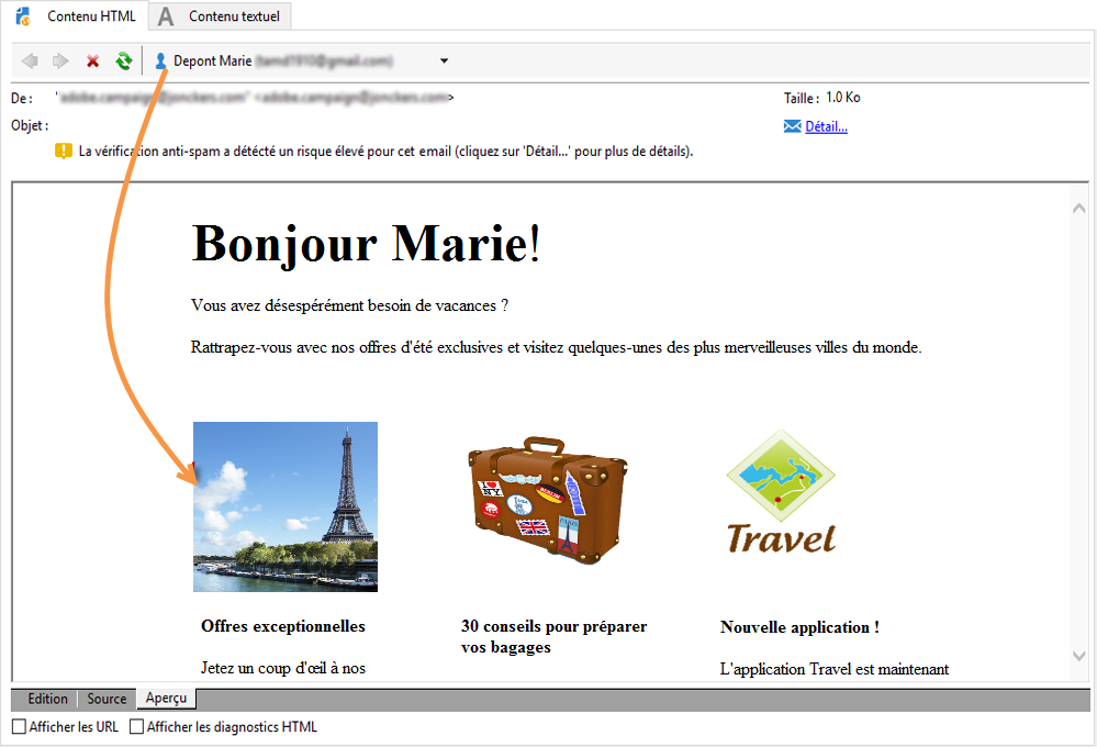 Dans Adobe Campaign, vous pouvez désormais prévisualiser votre e-mail et en tester le rendu pour différents destinataires. Vous pouvez constater que l'image change selon les différentes expériences créées. Pour en savoir plus sur la création d’un email, consultez cette page.