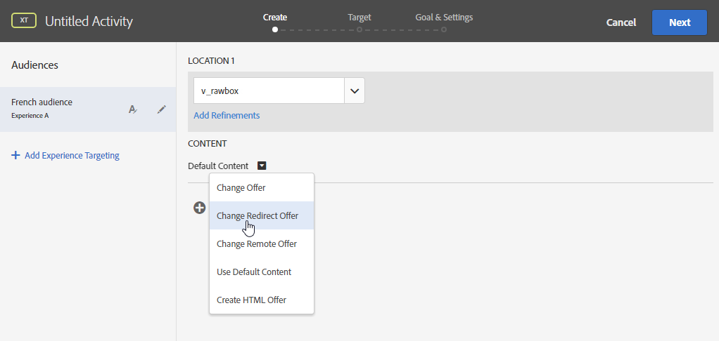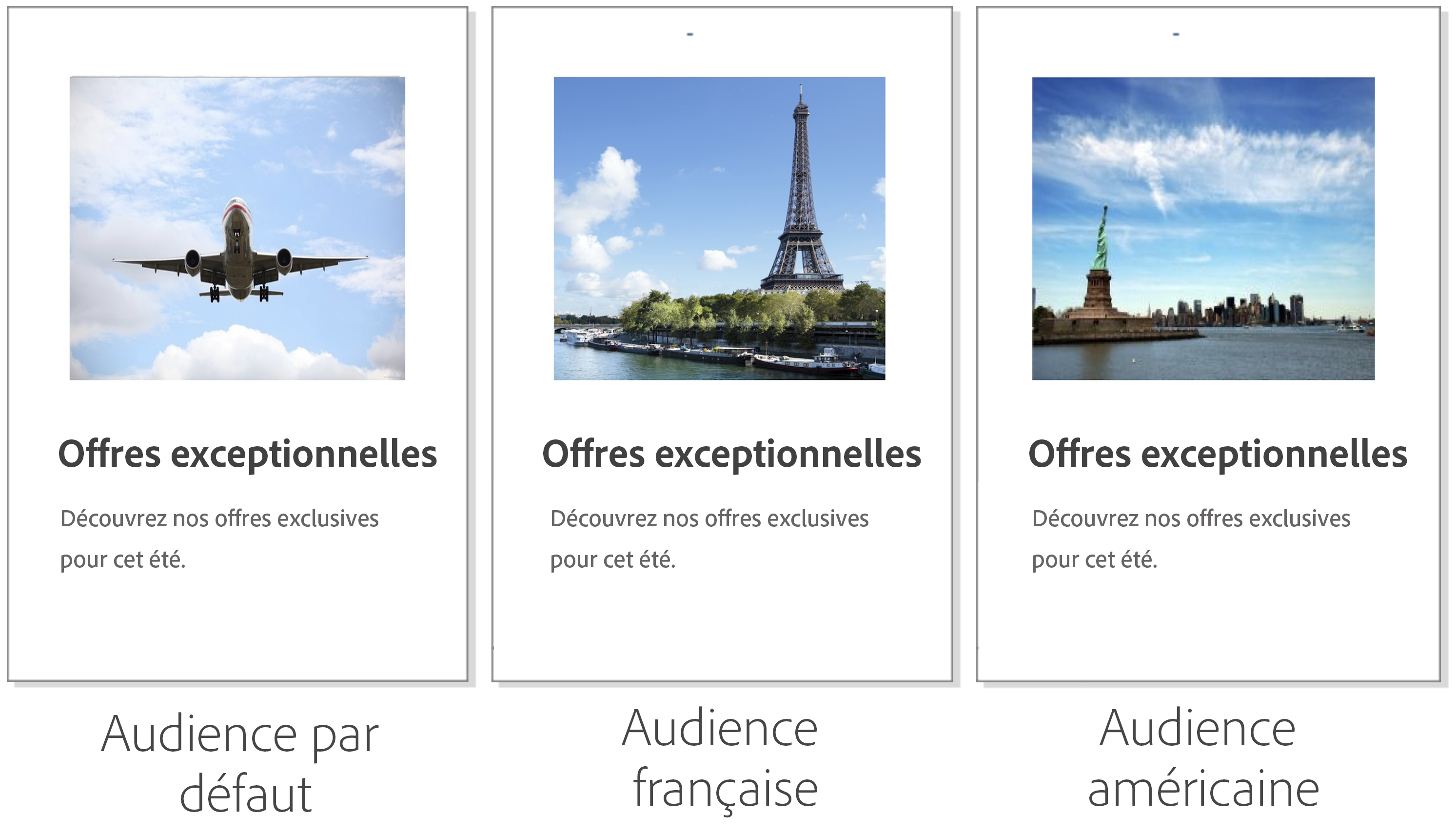 Avec Target, vous pouvez créer différentes versions de votre offre. Selon chaque expérience utilisateur, vous pouvez créer une offre de redirection et spécifier l'image qui sera affichée.