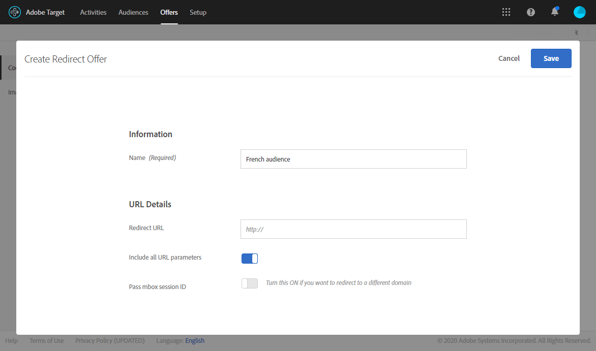 Dans notre cas, nous avons besoin de deux offres de redirection, la troisième (celle par défaut) étant définie dans Adobe Campaign.