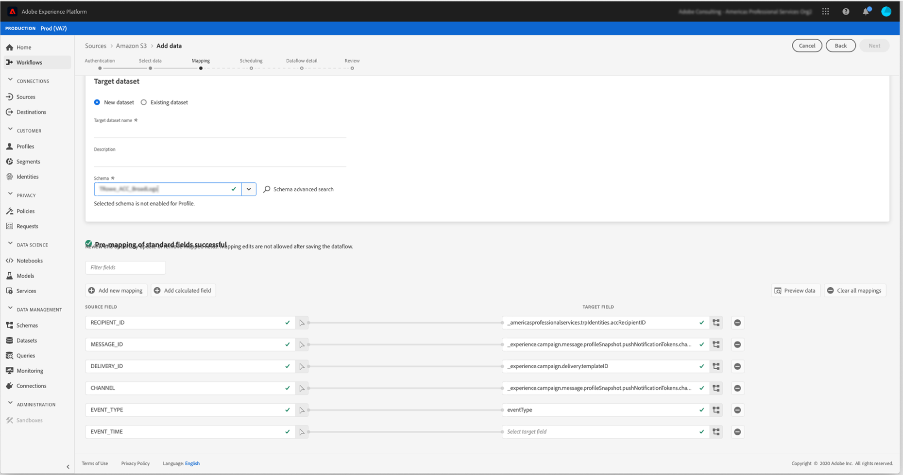 워크플로우가 구성되고 데이터가 저장소 위치로 전송되면 S3 또는 Azure blob 저장 공간 위치를 로 연결해야 합니다 소스 Adobe experience Platform에서 생성합니다.