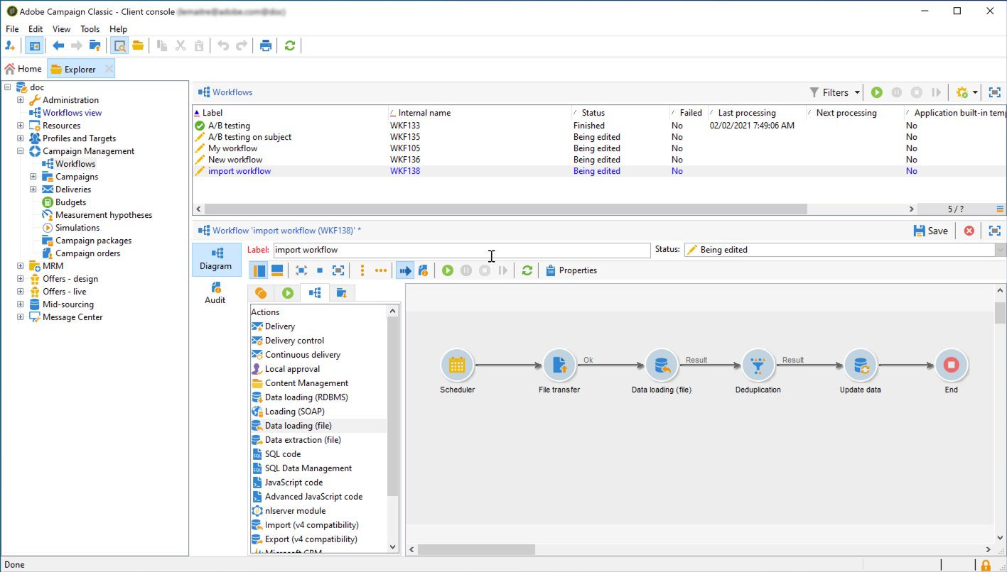 Campaign Classic이 대상으로 구성되면 Adobe Experience Platform에서 내보낸 파일을 가져오기 위한 전용 워크플로우를 빌드해야 합니다.